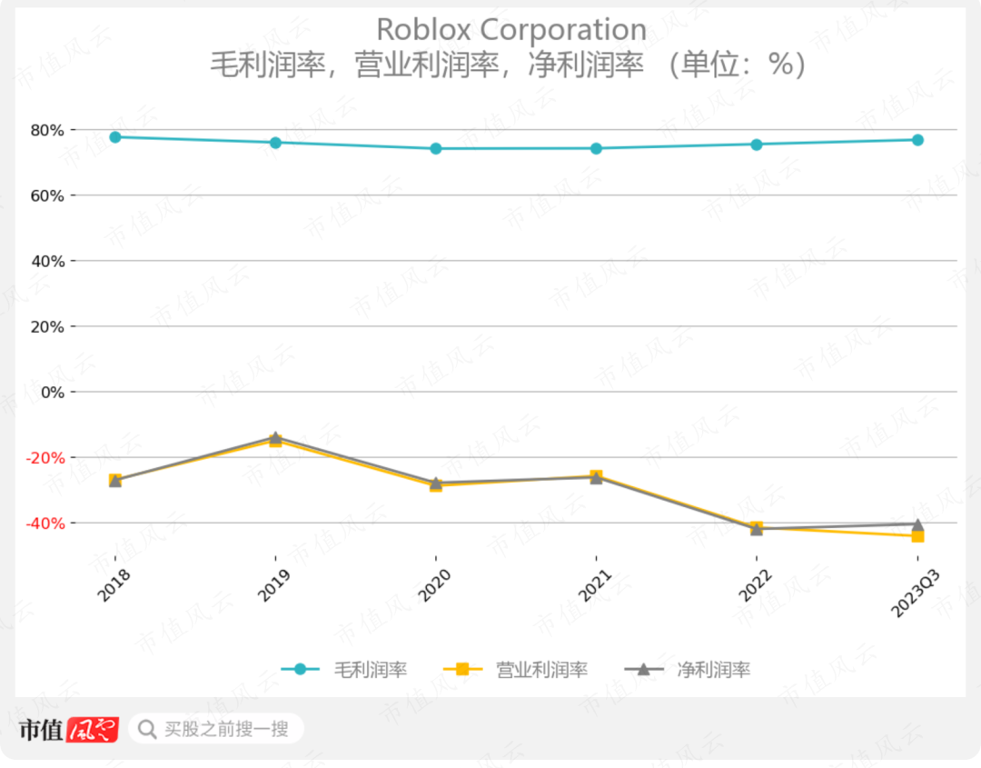 此外,Roblox在经营表现方面也面临明显挑战。自2019年,公司营业亏损率和净亏损率呈现恶化趋势。截至2023Q3,公司的毛利率为76.7%,营业亏损率为44.11%,净亏损率为40.5%。