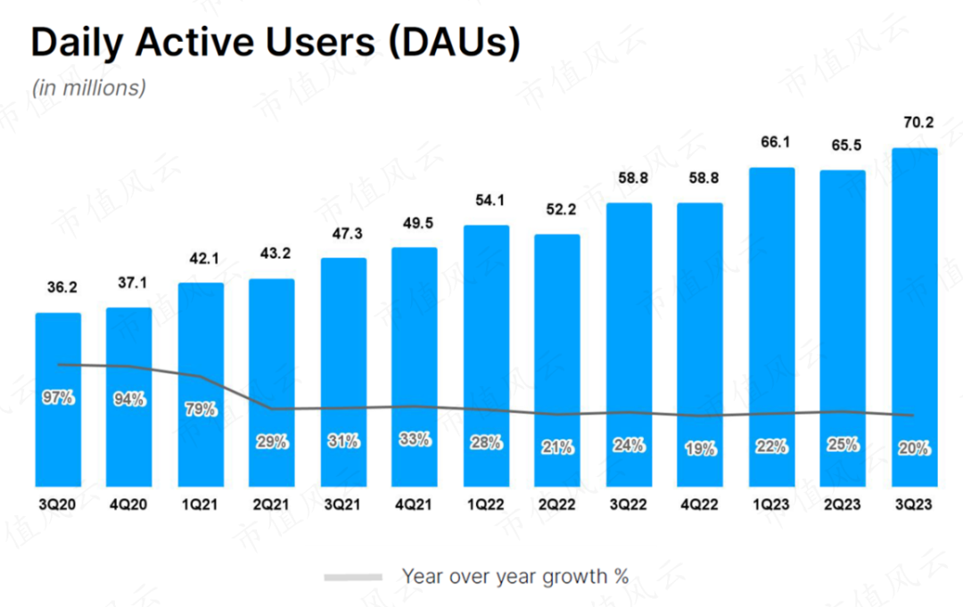 Roblox最近两年的营收增长得益于Roblox的日活跃用户数(DAU)和总计用户使用时长同比增长。截至2022年Q4,平台日活跃用户数增长至0.58亿,同比增长19%。截至2023年Q3更是达到0.7亿,同比增长20%。