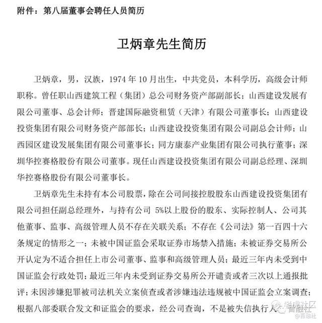 有关情况公告如下: 第八届董事会组成情况 1、非独立董事:卫炳章(董事长)、周杨(副董事长)、白平彦、 柴宏杰、 张宏杰、秦军平; 2、独立董事: 昝志宏、陈运红、曹俐。