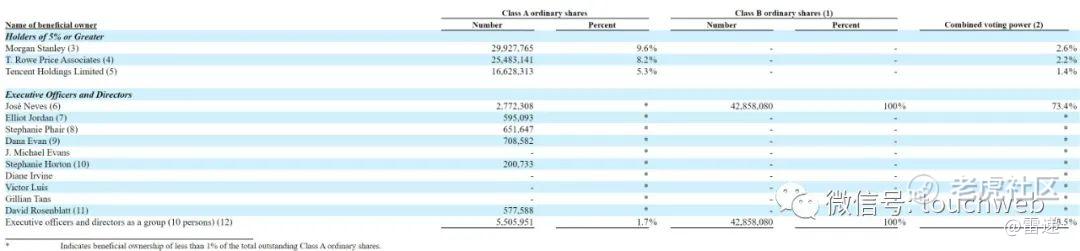 到2023年2月14日,Farfetch主要机构股东只剩下Baillie Gifford,持有13.3%的A类股,及3.9%的投票权。José Neves则拥有2%的A类股,及100%的B类股,及71.1%的投票权。