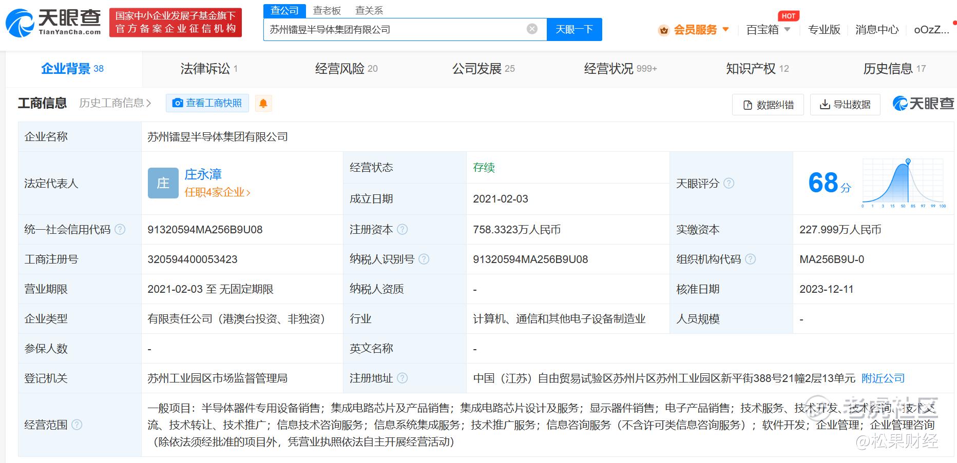 苏州镭昱半导体集团有限公司成立于2021年2月,法定代表人为庄永漳,经营范围包括半导体器件专用设备销售、集成电路芯片设计及服务、显示器件销售、电子产品销售、软件开发等。该公司全资持股镭昱光电科技(苏州)有限公司母公司。公开信息显示,镭昱为Micro-LED微显示芯片及解决方案提供商。