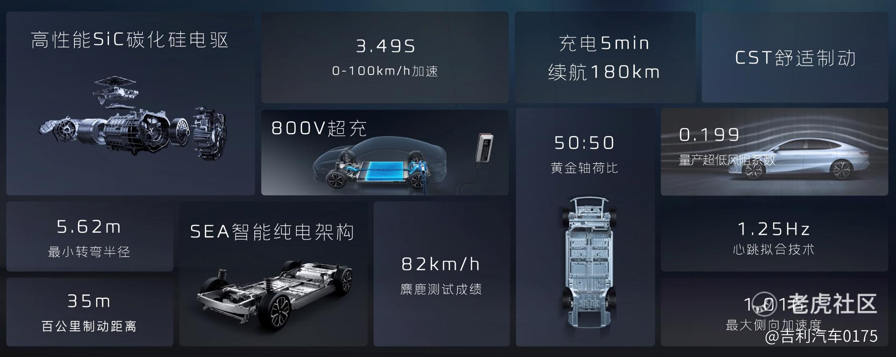 银河E8采用新一代800V极速闪充,电池、电机、电控、热管理系统全域800V,充电5分钟即可续航180km。在全新一代高性能碳化硅电驱的赋能下, 银河E8零百加速仅需3.49秒,麋鹿成绩高达82km/h。。尽管车长超过5米,银河E8转弯半径只有5.62m,做到了同级最小,街道赛道巷道都玩得转。另外,即使不堆砌成本高昂的大电池,吉利银河E8也能实现超长续航。