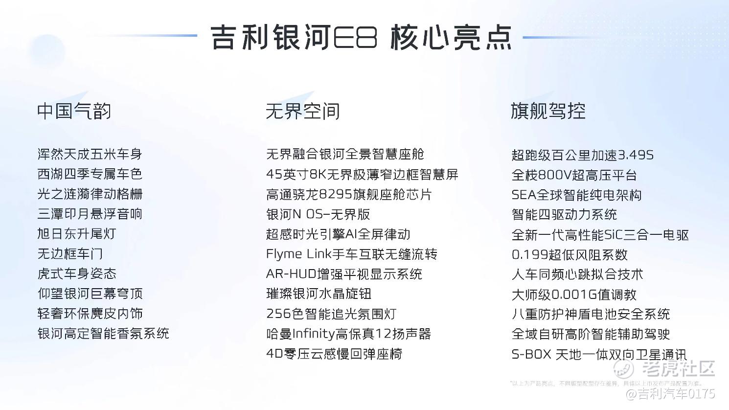吉利银河E8亮相以来,凭借引领世界潮流的中国风范受到广泛关注。全球首个量产的一体式发光前脸、律动发光徽标、虎视前灯、无框车门、坛翼车尾、旭日尾灯、润玉流光车身型面,三潭印月悬浮音响、荷塘涟漪副仪表台、仰望银河巨幕穹顶、书山叠嶂门板设计、西子水岸座椅绗缝、银河水晶旋钮等内饰设计,以及全球量产超低0.199风阻系数等设计,让未来科技融于中国气韵,成为全球典范。