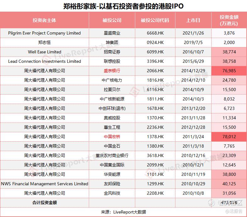 基石投资方面,据LiveReport大数据,2010年之后,郑裕彤家族以基石投资者身份投资港股IPO公司共有18家,总投资金额约47.39亿港元,投资项目包括招商证券、联想控股、中广核、友邦保险等知名企业。单笔投资金额最大的项目为中国宏桥,耗资约7.8亿港元;其次为盛京银行,耗资约7.7亿港元。