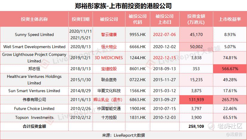 上市前投资方面,据LiveReport大数据,2010年之后,郑裕彤家族于企业上市前投资的港股公司总共有9家,总投资金额约25.81亿港元,较为知名的公司有辉山乳业(已退市)、联合医务以及恒大物业,而近一年IPO的参投公司有3D MEDICINES及智云健康。