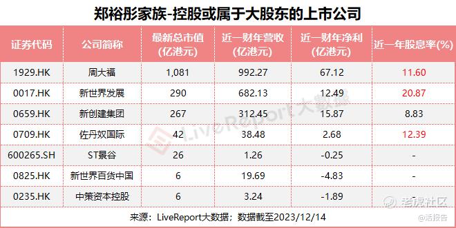 据LiveReport大数据,郑裕彤家族控股的或属于大股东的上市公司共计7家,分别为周大福、新世界发展、新创建集团、新世界百货中国、佐丹奴国际、中策资本控股,以及A股上市公司ST景谷。