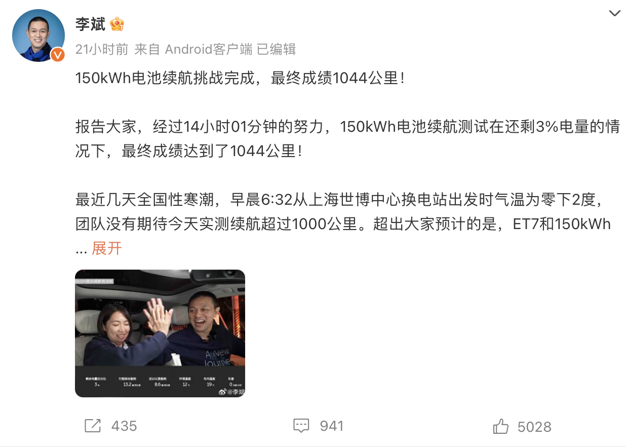 而后又在12月17日的周末,李斌又早早起来赶在6点30分出发,亲测蔚来即将推出的150度电池包能否完成1000公里纯电续航。为了将宣传效果最大化,李斌对这场亲身参与的续航测试进行了全程直播。最终,在这场李斌亲自驾车跑续航的直播活动中,搭载150度电池的ET7从上海出发,终到福建省厦门市。最后在电量还剩3%的情况下,达成续航1044公里。