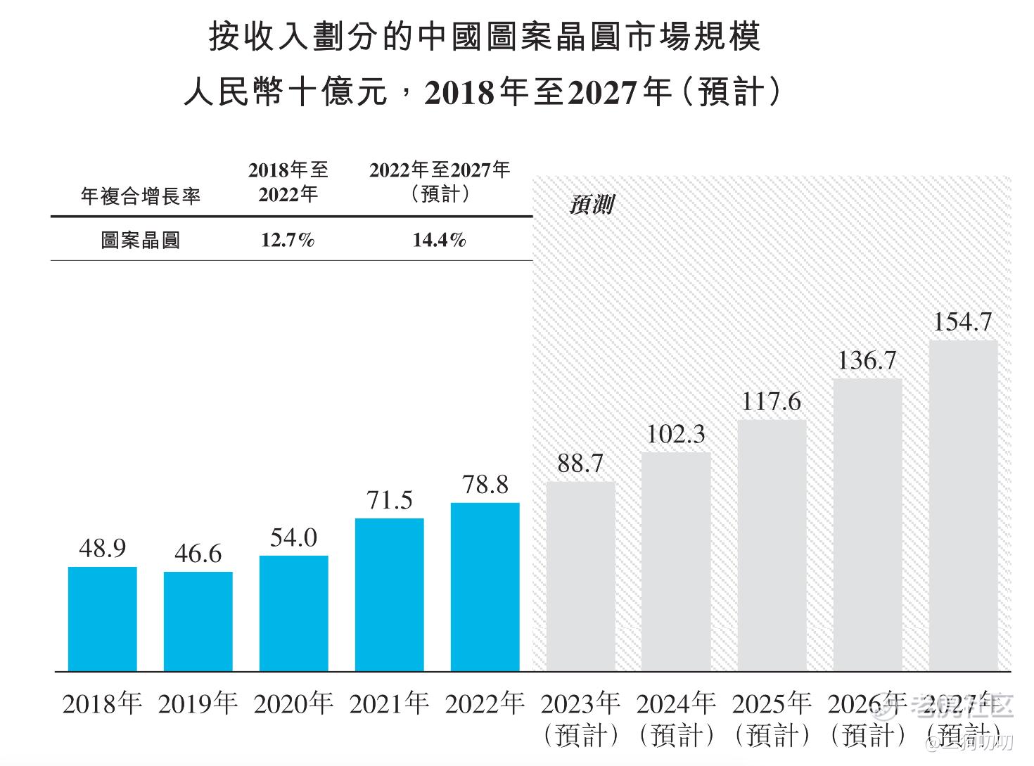 得益于巨大的市场需求和李好的行业政策,国内图案晶圆市场已经成为一种新兴趋势,其市场规模由2018年的489亿元增至2022年的788亿元,期间年复合增长率为12.7%,预计到2027年市场规模将达到1547亿元,2022年至2027年年复合增长率为14.4%。总的来说,公司所处的行业发展前景还是很不错的。