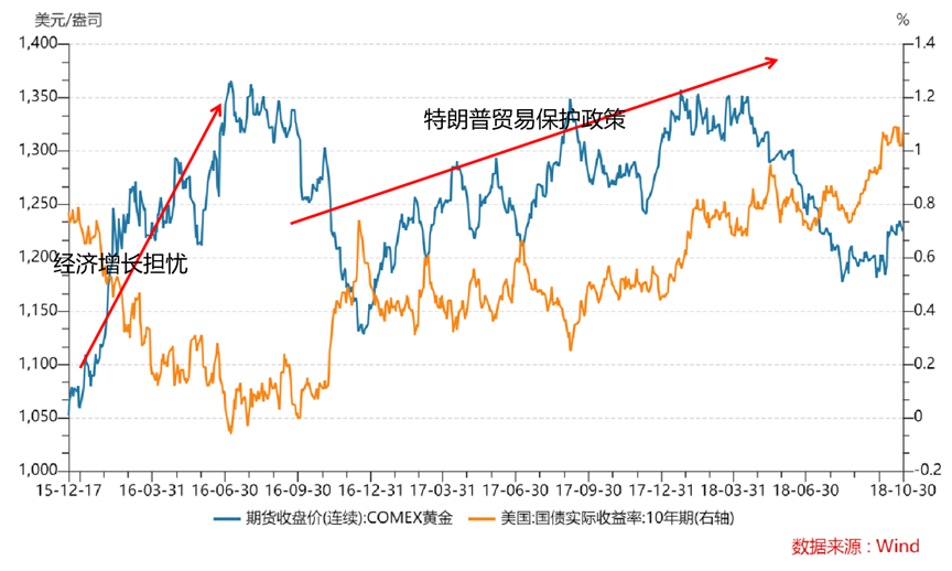 2015年12月17日到2018年10月30日,美债实际利率波动上行,黄金震荡调整。此次美债实际利率上行中,黄金并没有明显的下跌,甚至是有所上涨。期间,美联储分别在2015年、2016年进行了一次加息,2017年进行了3次加息,2018年进行了4次加息。在2016年初期,对经济增长的担忧引发了资本市场波动,美股大幅下跌,给黄金带来了上涨机会。同时,日本央行将利率设置到了零以下,也带动了黄金价格的上涨。随后2017年和2018年,特朗普一系列贸易保护政策、英国脱欧等风险因素上升,黄金上涨,跟美债实际利率波动脱钩。而到了2018年,美联储加息政策发威,2018年4月到10月,美债实际利率大幅上涨,美元指数也开启上涨,黄金进入下跌趋势。