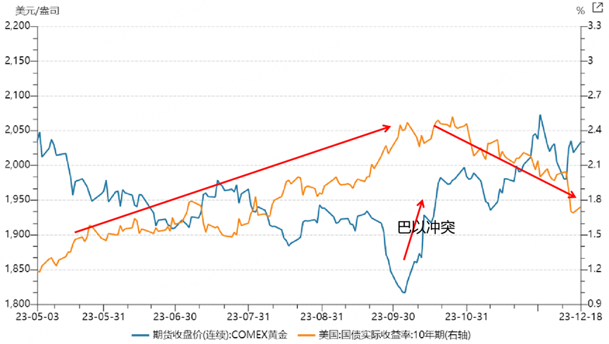 2023年10月6日黄金见底反弹至今,以反弹为主。美国实际利率刚刚见顶,市场围绕美联储停止加息展开博弈。但10月7日,巴以开启新一轮冲突,10月9日美元直接跳空高开,带动黄金的避险因素占据主要动力。
