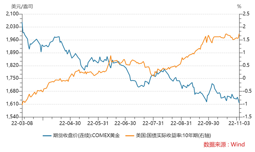 再往前,2022年3月8日到2022年11月3日,美债实际利率持续上涨,黄金震荡下行,回调幅度达到26%。这段时间美联储从3月份开启加息,在3月、5月、6月、7月、9月到11月分别加息,将联邦基金目标利率提升到了3.75%到4.00%,美债实际利率也持续走高。黄金也持续走低,两者保持很高的相关度。