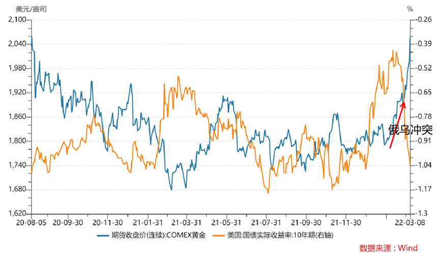 2020年8月5日到2022年3月8日,美债实际利率震荡调整,黄金价格同样震荡。这段时间,黄金跟美债实际利率的相关系数较低,相关系数只有-0.25。期间主要受到美联储缩表、疫情反复、通胀等多重因素的影响,但是并没有一个决定性的因素,黄金震荡调整。期间,在2022年1月到3月,黄金经历一波大涨,黄金价格再次突破2000美元/盎司,主要是俄乌冲突导致避险情绪大幅上升。2022年2月24日,俄罗斯总统普京宣布对乌克兰发动“特别军事行动”。这一事件扭转了黄金的震荡趋势,但是时间并不长。
