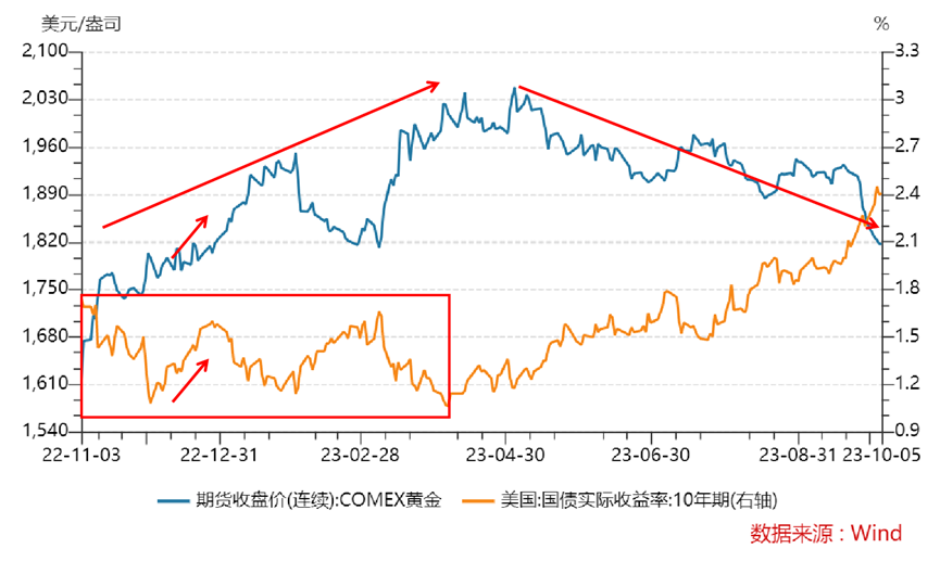 2022年11月3日到2023年10月5日,市场围绕美联储加息博弈,黄金先涨后跌。有意思的是,在这一波上涨中,美国收益率只是在震荡,黄金却反而一直上涨。