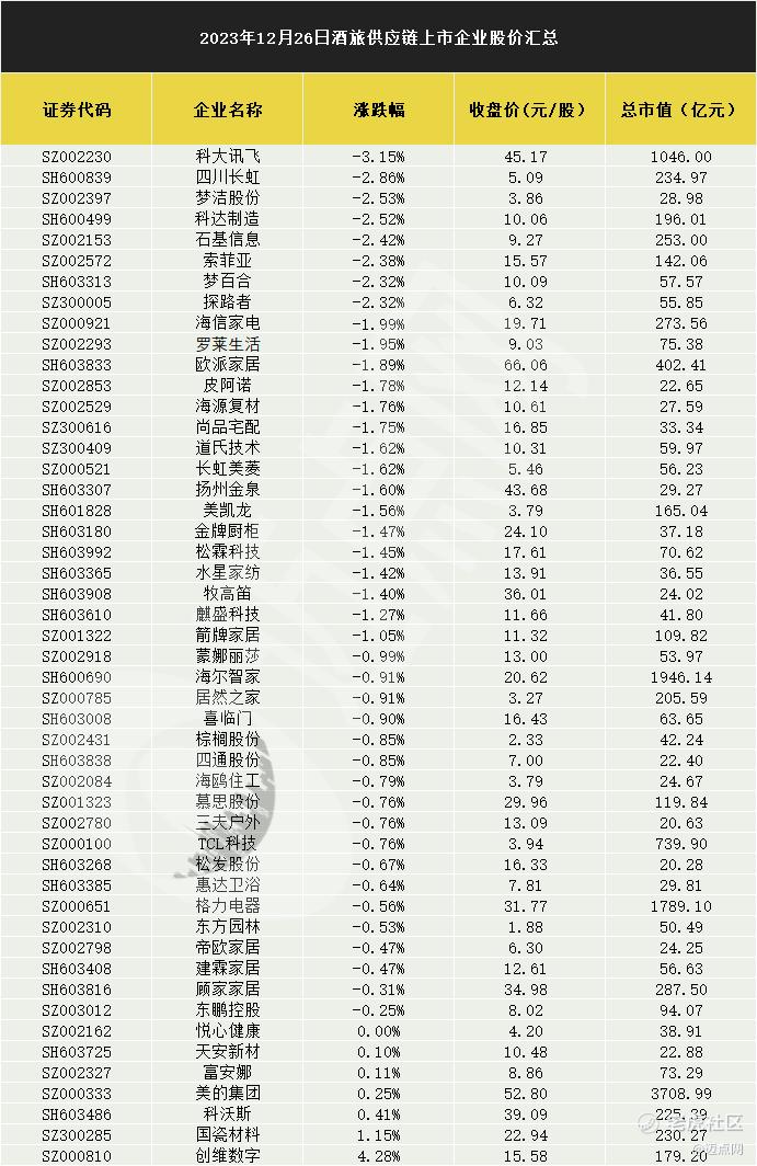 酒旅供应链个股方面,科大讯飞(SZ:002230)跌超3%,四川长虹(SH:600839)、梦洁股份(SZ:002397)、科达制造(SH:600499)等跌超2%。