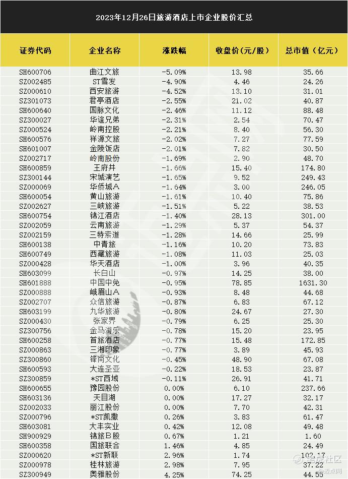 旅游酒店个股方面,ST雪发(SZ:002485)一字板跌停,曲江文旅(SH:600706)跌超5%,西安旅游(SZ:000610)跌超4%,君亭酒店(SZ:301073)、国脉文化(SH:600640)等跌超2%。