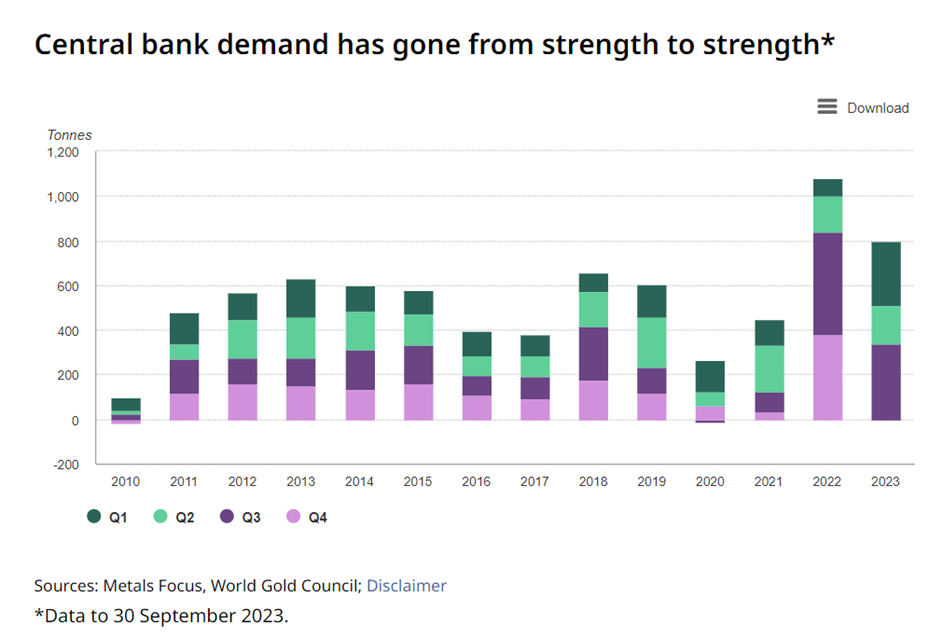 但这个不重要,2024年黄金的一个关注点就是,央行购金会不会持续,一个品种,有人过去两年买下了25%的流通盘,那么毫无疑问,这就是最重要的关注点。
