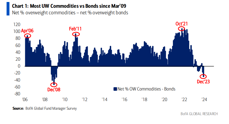 写在最前面的话,在去年的时候,我希望今年可以建立一些对于原油的理解,我觉得今年还是很开心能够在原油上赚到钱,当然这要感谢夏天的时候,我记得当时在美国见了一个分析师,当时是六月初,我问他未来半年你最确定的交易是什么,他说是多油,他说他没想到在美国的消费旺季前,竟然有人把油价干到了让OPEC不爽的低位,他都不知道现在交易原油的是什么牛鬼蛇神,从那次之后,我对于美国交易者对于原油的看法就抱有深深地怀疑,这群在2008年之后成长起来的基金经理,对于大宗商品的理解我觉得是存疑的,此时此刻,在2024年之前,大宗商品的配置比例来到了过去15年的最低点,市场对于明年油价很多悲观的看法,让我感觉又回到了今年夏天。