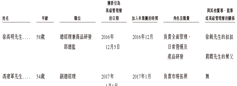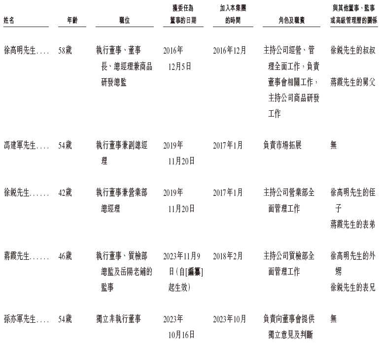 高管包括:执行董事、董事长、总经理兼商品研发总监徐高明先生、执行董事兼副总经理冯建军先生、执行董事兼营业部总经理徐锐先生,执行董事、质检部总监及岳阳老铺监事蒋霞先生。
