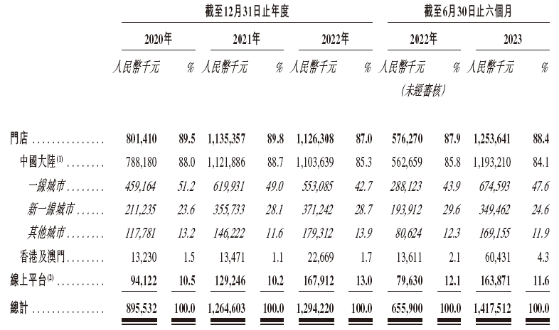 老铺黄金,采取全自营模式和主题情景店模式经营公司的全部线下门店。截至2023年11月3日,老铺黄金在全国高端商业中心自营了29家主题情景门店,多数位于一线和新一线城市,涵盖了全国十大高端购物中心中的八家,全部位于包括SKP和万象城在内的高端时尚百货商场。根据弗若斯特沙利文的数据,2022年在中国所有黄金珠宝品牌中,老铺黄金的单店收入排名第一。截至2023年6月30日止六个月,老铺黄金有21家同店(比较两年内均营业超过300天或比较六个月内均营业超过150天的门店),同店销售额达人民币10.48亿元。同期,老铺黄金位于北京SKP的两家门店产生的总收入为人民币1.54亿元,实现每平方米每月收入约人民币42.7万元。