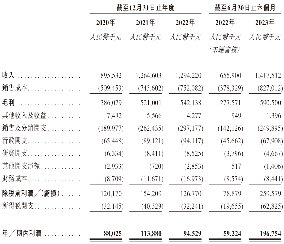 招股书显示,在过去的2020年、2021年、2022年和2023年上半年,老铺黄金的营业收入分别为8.96亿、12.65亿、12.94亿和14.18亿元人民币,相应的净利润分别为0.88亿、1.14亿、0.95亿和1.97亿元人民币。