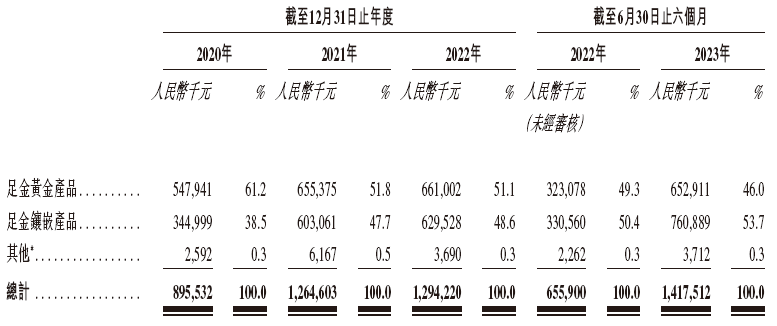 老铺黄金的所有黄金产品均由千足金(9999)制成,根据是否镶嵌钻石或其他宝石,分为足金黄金产品、足金镶嵌产品,公司的收入主要来自销售上述产品,以及包括其他少量收入来自销售主要以宝石制成的非黄金产品和所售珠宝产品的保养维修服务。