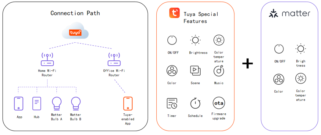 差异化:除了天然拥有 Matter 标准功能,开发者还可以直接使用涂鸦特有功能,比如:不依赖 hub ,也能远程控制;还能助你轻松实现场景自定义、固件升级、定时和音乐播放功能,让 Matter 产品功能更丰富多样;
