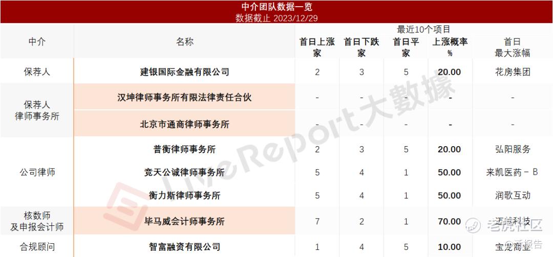 据LiveReport大数据统计,健康之路中介团队共计8家,其中保荐人1家,近10家保荐项目数据表现一般;公司律师共计3家,综合项目数据一般。整体而言中介团队历史数据表现一般。