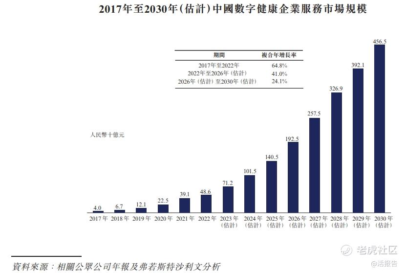 根据弗若斯特沙利文的资料,中国数字健康企业服务市场的市场规模由2017年的人民币40亿元增加至2022年的人民币486亿元,复合年增长率为64.8%;预计2026年将增加至人民币1,925亿元,复合年增长率为41.0%。预计市场规模将于2030年进一步增至人民币4,565亿元。