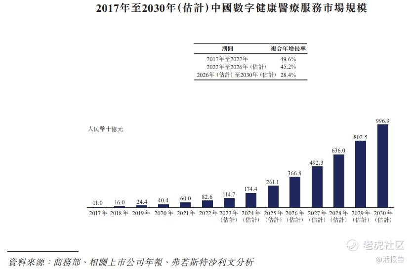 根据弗若斯特沙利文的资料,中国数字健康医疗服务市场的市场规模由2017年的人民币110亿元增加至2022年的人民币826亿元,复合年增长率为49.6%;预计2026年将增至人民币3,668亿元,复合年增长率为45.2%,预计市场规模将进一步增至2030年的人民币9,969亿元。