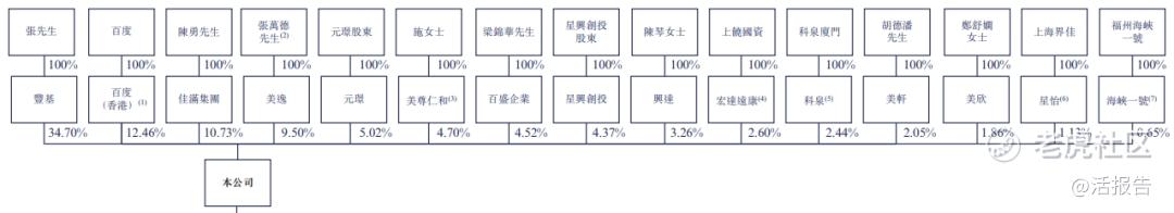 张先生通过丰基持股34.7%;百度持股12.46%;陈勇先生通过佳满集团持股10.73%;张万德先生(张先生兄弟)通过美逸持股9.5%。