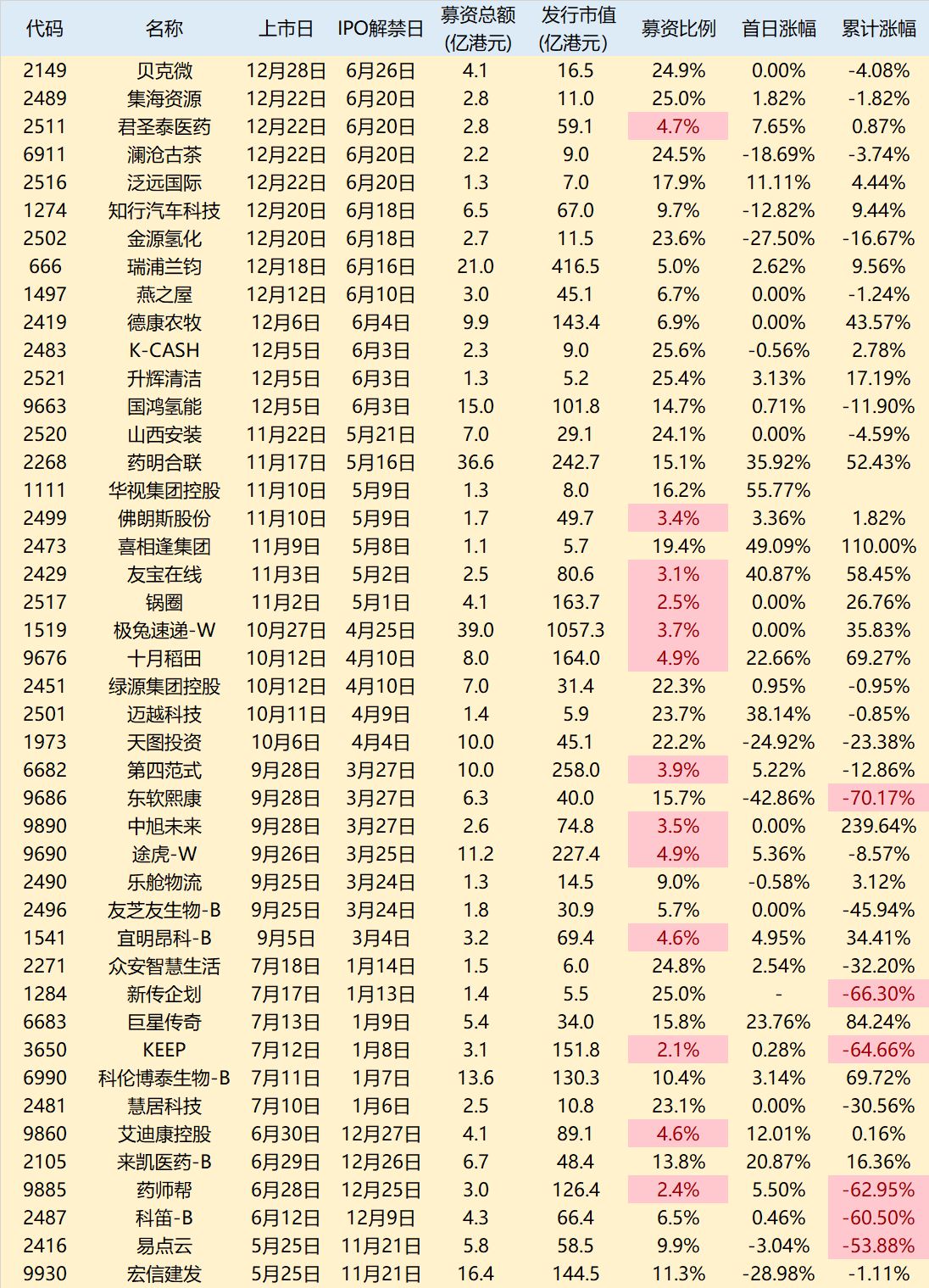 $KEEP(03650)$ 在1月4日崩盘,其实也是解禁前的预演。一些在2023年IPO中募资比例极度压缩的公司,都面临更高的解禁压力。下表整理了2023年下半年的香港IPO,其中募资比例小于5%的,都要当心。当然超过5%的也并不代表安全。