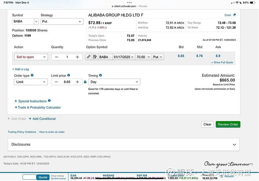 除了投资常识和观点,还有自己的小操作。去年12月5日,段永平发动态说计划再卖些阿里巴巴的put(看跌期权),同时分享了张确认订单页面截图。