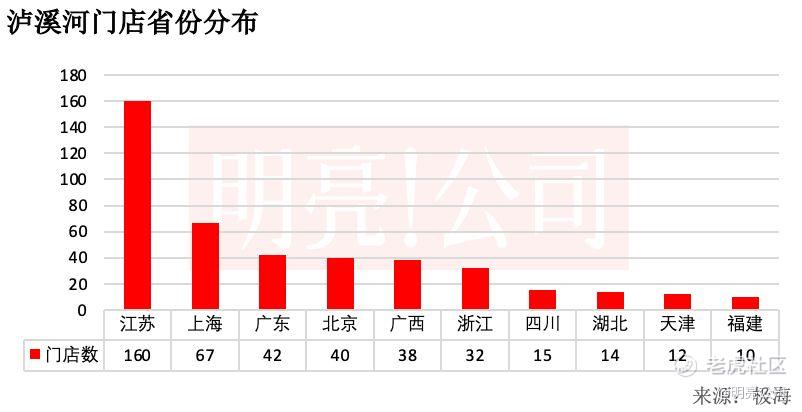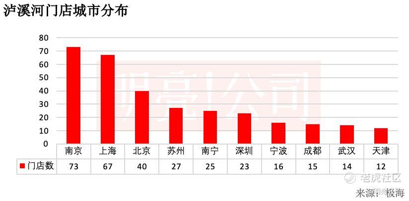 在城市分布上,南京有最多的泸溪河门店,目前有73家,其次是上海和北京,分别有67家和40家门店,之后是江苏的城市苏州也有27家门店。南宁有25家门店,深圳也有23家门店。