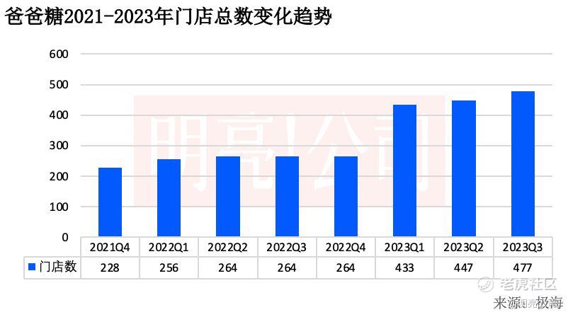 2021年四季度爸爸糖总门店为228家,进入2022年新增门店缓慢,到2022年四季度门店总量仍为200多家,四季度总门店为264家。2023年一季度由于新增近200家门店,总门店到二季度已超过400家,为433家门店,到当年的三季度,爸爸糖总门店到了477家。