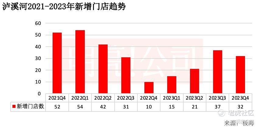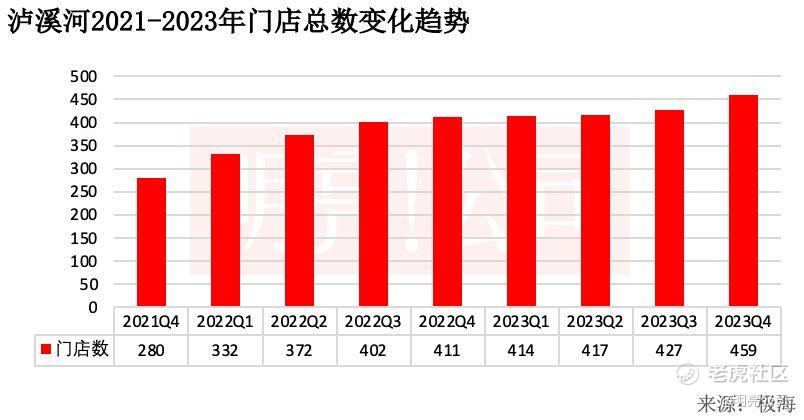 在总门店上,泸溪河在2021年四季度门店数为280家,到2022年一季度门店突破300家、数达到了332家,在2022年初,还有不少新增门店,所以到当年三季度突破400家至402家,2022年到2023年初期新增门店缓慢,因而门店总量一直维持在400多家,到2023年四季度,泸溪河的门店数仍然还在400多家,为459家。