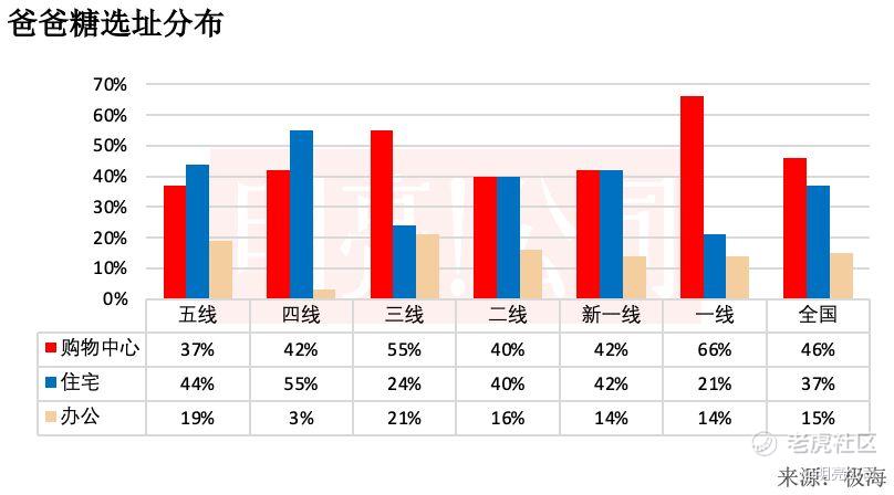 爸爸糖在选址上,也是偏向在商场。全国门店有46%的门店都分布在商场,37%的门店分布在住宅。