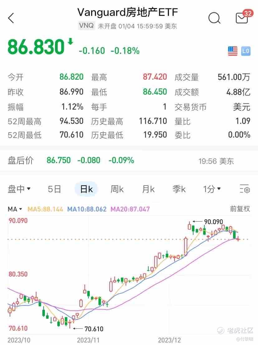 从技术面来看,VNQ在过去一年里呈现出震荡走势。自10月底创下新低以来,它经历了一次触底反弹,并随后震荡上行。截至年底,VNQ的净值创下近期新高,然后持续盘整。成交量与之前的量差不多,没有出现异常情况。