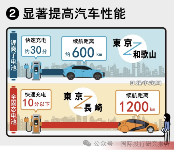 全固态电池被认为是纯电动汽车的新一代电池的首选,汽车企业等竞相推进研发。丰田希望通过10分钟以内的充电,实现现有纯电动汽车2倍以上的续航里程(1200公里),正在推进开发,力争在2027~2028年实现商品化。