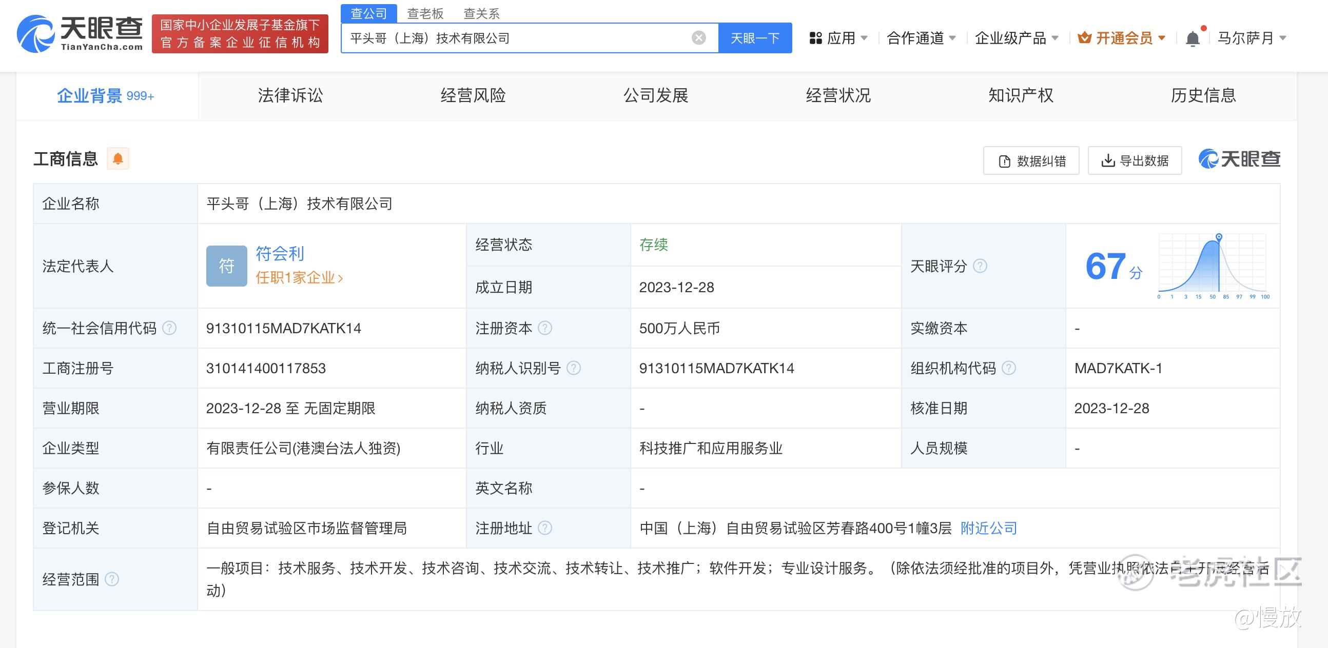 【#阿里平头哥在上海成立技术公司#】 天眼查App显示,近日,平头哥(上海)技术有限公司成立,法定代表人为阿里巴巴平头哥副总裁符会利,注册资本500万人民币,经营范围含软件开发、专业设计服务等。股东信息显示,该公司由T-head (Hong Kong) Limited全资持股。