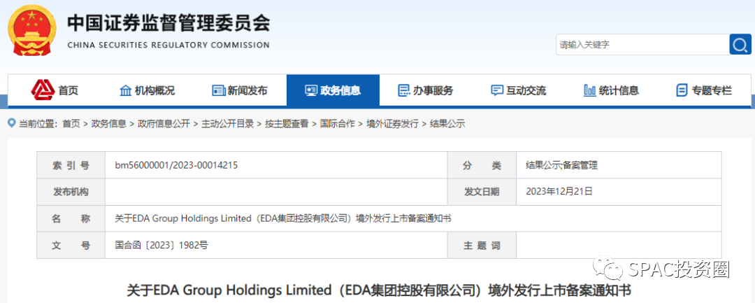 12月21日,中国证监会国际合作部发布关于EDA Group Holdings Limited(EDA集团控股有限公司)境外发行上市备案通知书(国合函〔2023〕1982号)。