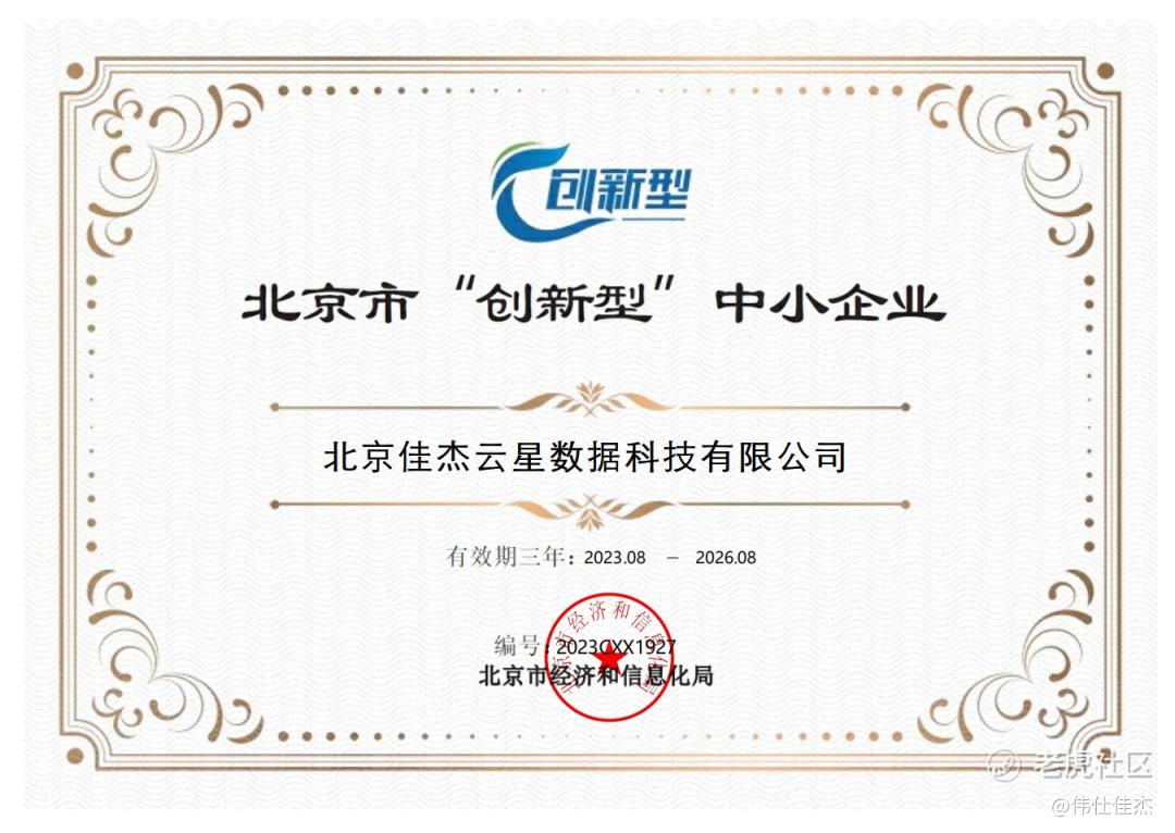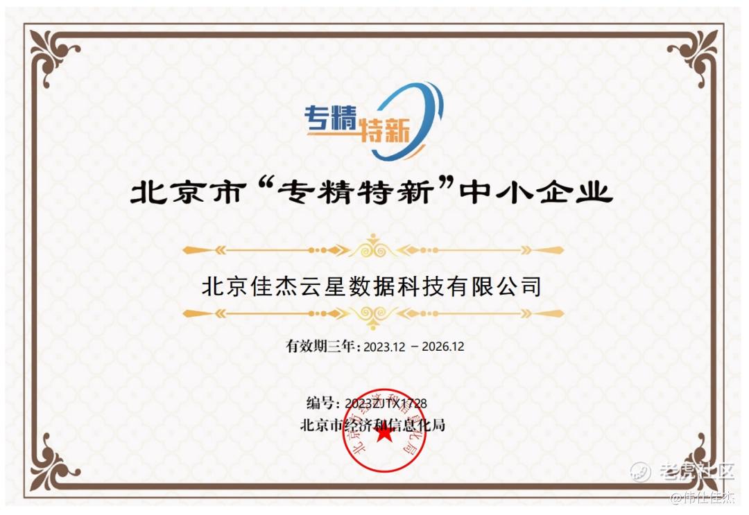 近期,北京市经济和信息化局发布公告,对新一批北京市2023年专精特新中小企业名单进行公示。现公示期结束,佳杰云星(全称“北京佳杰云星数据科技有限公司”)正式获评北京市专精特新中小企业。