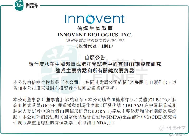 1月9日, $信达生物(01801)$ 发布公告称,公司的胰高血糖素样肽-1受体(GLP-1R)/胰高血糖素受体(GCGR)双重激动剂玛仕度肽(研发代号:IBI-362)在中国超重或肥胖成人受试者中的首个III期临床研究(GLORY-1)达成主要终点和所有关键次要终点。