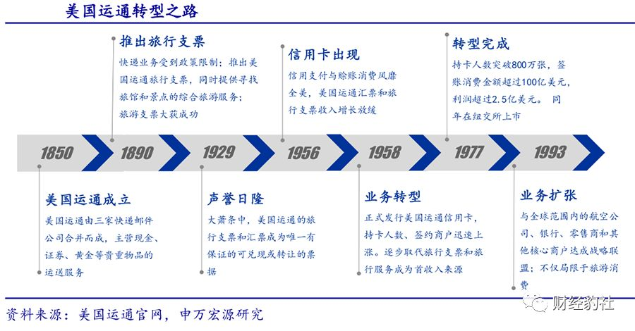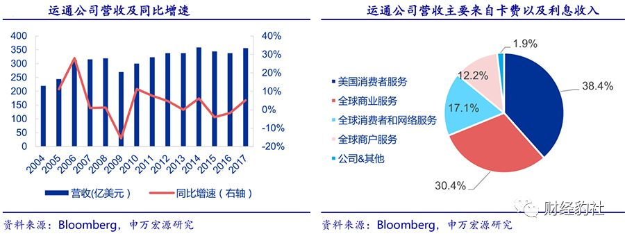 美国运通是国际最大的旅游服务及综合性财务、金融投资公司,同时也是全球最大的独立信用卡公司。2017年实现营收、净利润分别达2006.78亿元、178.78亿元,同比增长分别为2.06%、-49.41%,公司在160年中先后三次业务转型,二战后开始发展旅行社业务,之后介入消费支付领域,开发签账卡以及信用卡。