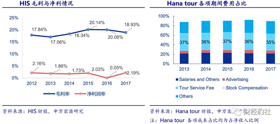 出境游产品的成本主要来自上游机酒与支付给地接社的费用,上下游资源端和消费端对中游渠道的利润挤压非常严重,日韩出境游行业集中度较高使得毛利水平维持在20%左右,毛利水平明显高于众信的10%、凯撒的14%。除了产品成本外,人力成本、房屋租金、销售推广费也是费用主要支出,Hana tour职工薪资、门店销售管理费用分别占比超20%、35%,使净利率停留在2%的低位。2017年我国旅行社众信旅游管理人员薪、销售人员薪酬、期间费用占净利润分别为5.6%、31.7%、70.9%,凯撒旅游则分别为10.9%、16.9%、70.1%,期间费用占比远低于Hana tour的90%,因此,旅游行业集中度的提升,有利于提升毛利率和净利率。