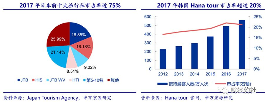 日本旅行社中出境游交易额稳居前两位JTB和HIS目前分别占据18%、16%以上的出境游市场份额,前十大旅行社市占率近75%。2017年韩国第一大旅行社Hana Tour市占率达21.3%,日韩旅游行业集中度较高,出境服务市场由少数龙头控制。