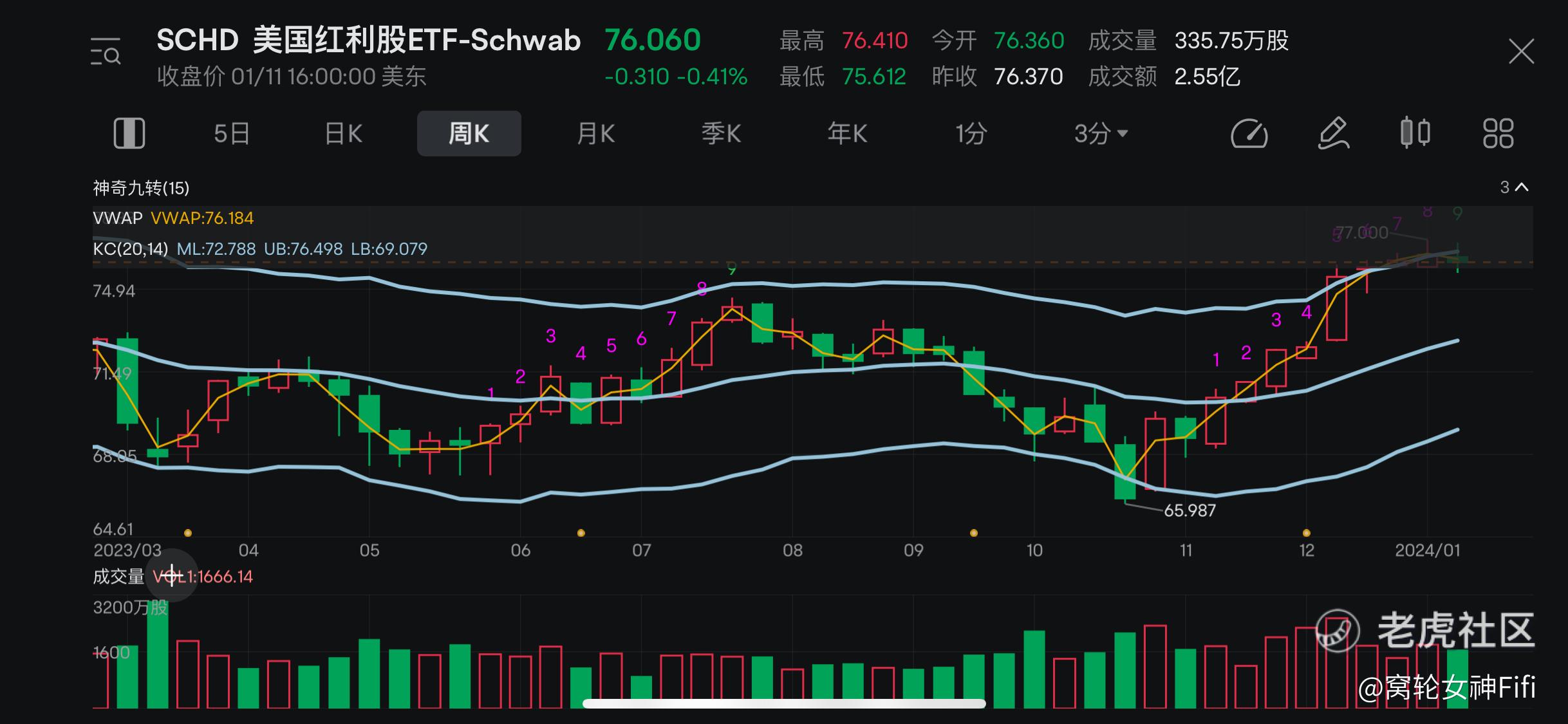 我们从周K线上看到SCHD波动较为剧烈,经过多轮震荡后,从去年10月下旬开始,价格一路走高。