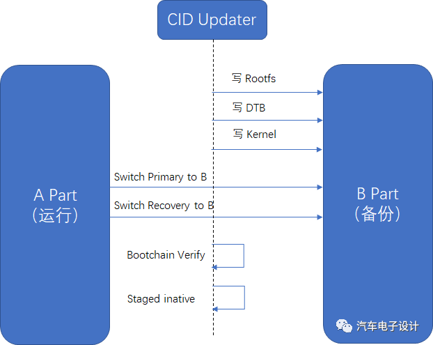 通过类似于A/B Update的方式,车内其他强运算力的联网组件(如IC、APE等)根据cid-updater提供的固件文件进行升级。