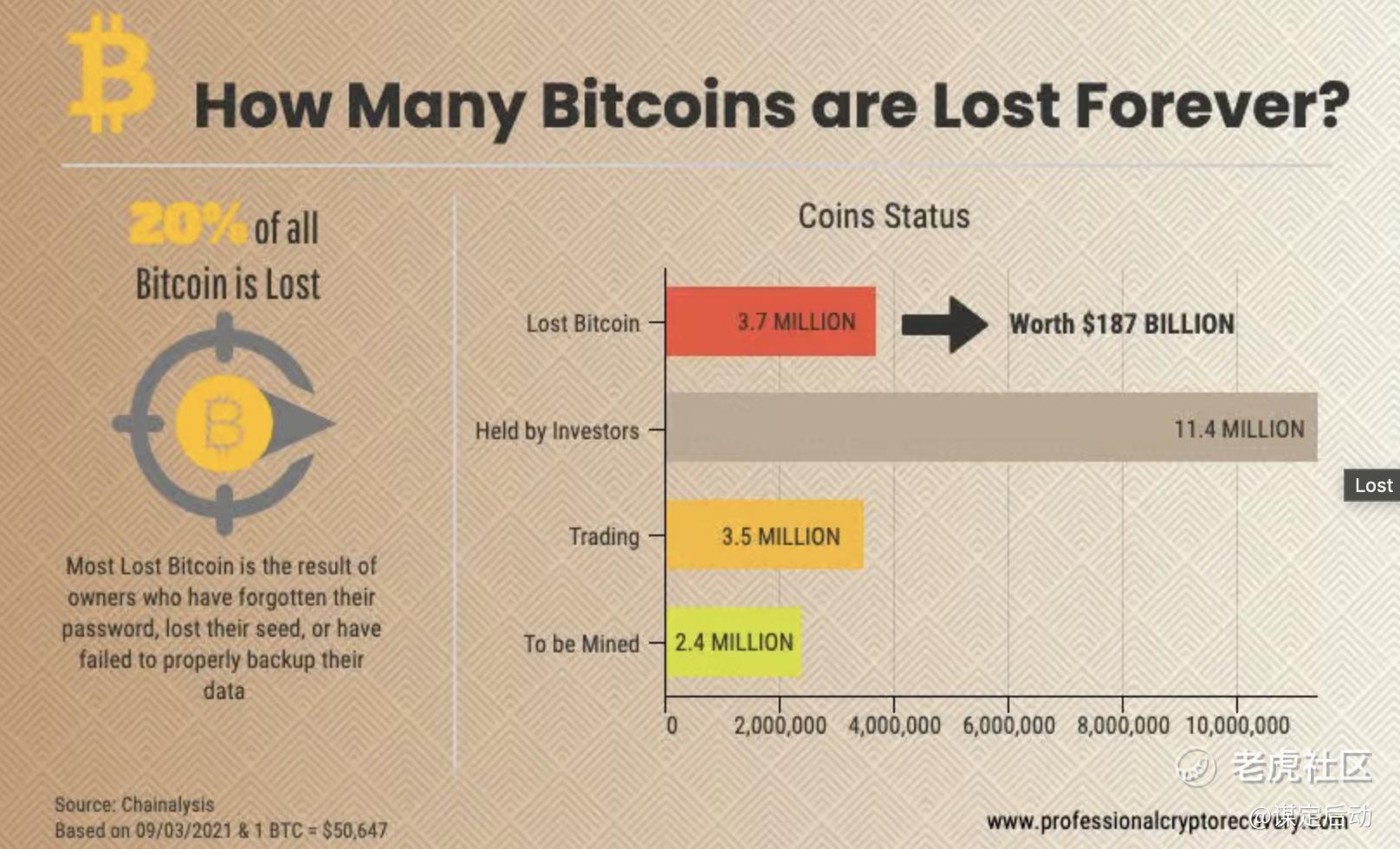 2021年区块链分析公司Chainalysis发布的报告显示,从重复交易、密钥寻找、沉睡状态等多个因素综合分析,至少有370万枚比特币已经沉睡了五年,这些沉睡或丢失的比特币相当于比特币总量2100万个的20%以上。