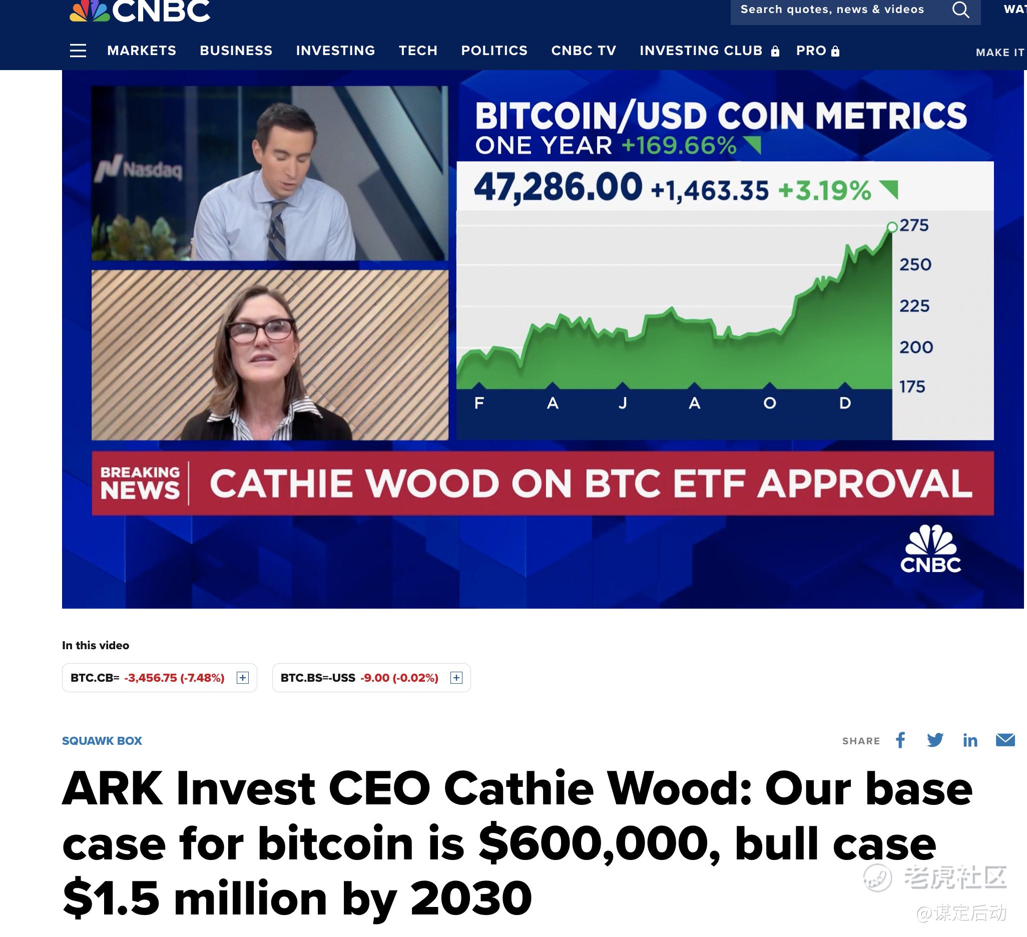 比特币大多头木头姐接受CNBC采访时说,他们团队的研究结果显示,到2030年比特币价格最起码到60万一枚,牛市情况下能到一百五十万。当然,这个我们听听就好,2030年还太远了。