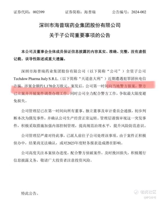 $海普瑞(002399)$ 【海普瑞:子公司遭电信诈骗 涉案金额逾9000万元】1月14日,海普瑞公告称,公司全资子公司Techdow Pharma Italy S.R.L.近期遭遇犯罪团伙电信诈骗,涉案金额约1170余万欧元(约人民币9180万元)。案发后,公司第一时间向当地警方报案,警方已立案并开展案件调查办理工作。同时公司全力配合警方工作,争取最大限度避免损失。(公司公告)